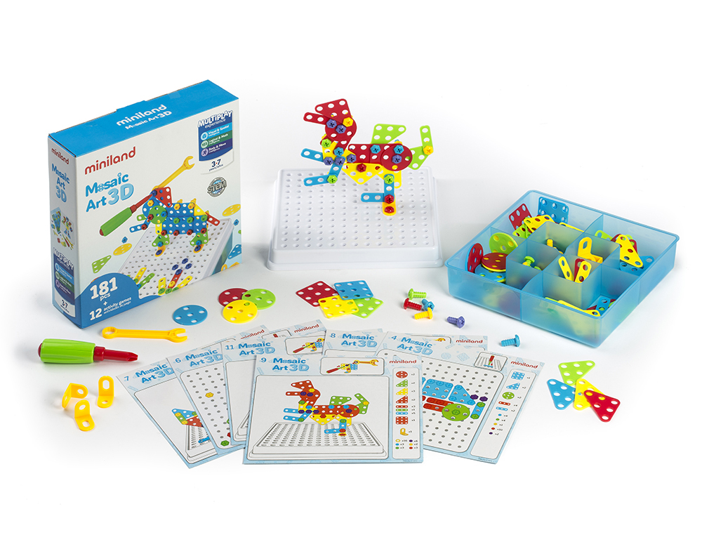 Descripción detalladaCon Mosaic Art 3D se construye en 2 y en 3 dimensiones sobre un resistentesoporte de montaje, que a su vez es la tapa del contenedor donde se guard a todo el contenido.