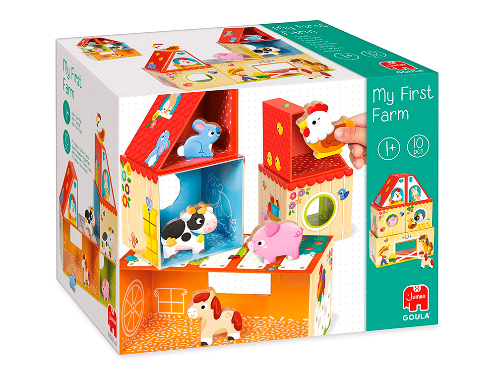 Juego para la primera infancia que consiste en construir una granja apilando las piezas de diferentes maneras. Hay 5 animales de manera (gallina, vaca, caballo, cerdito, conejo) para poder jugar una vez la granja esté construida. Existen muchas combinaciones para formar diferentes granjas. El juego está ilustrado por dentro y por fuera y todas las piezas se pueden guardar dentro de la pieza más grande.