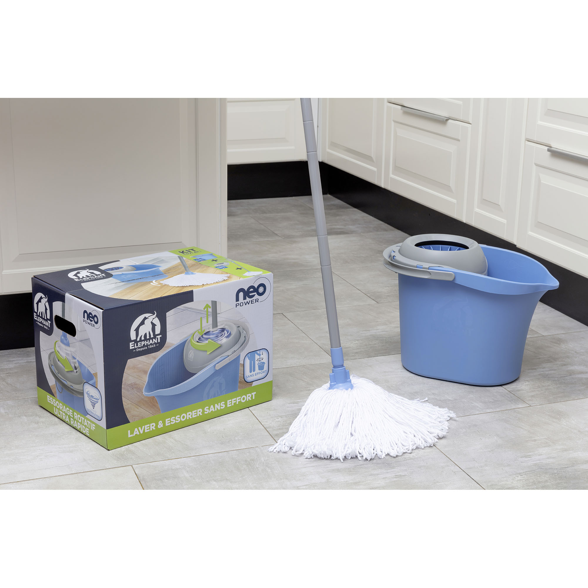 Neo Power es el kit de limpieza todo en 1 perfecto para limpiar el suelo sin esfuerzo y sin mojarse las manos. Cubo, escurridor, mango giratorio y fregona 100 % microfibra. No es necesario hacer fuerza para escurrir, la presión del mango hace girar el escurridor automáticamente.