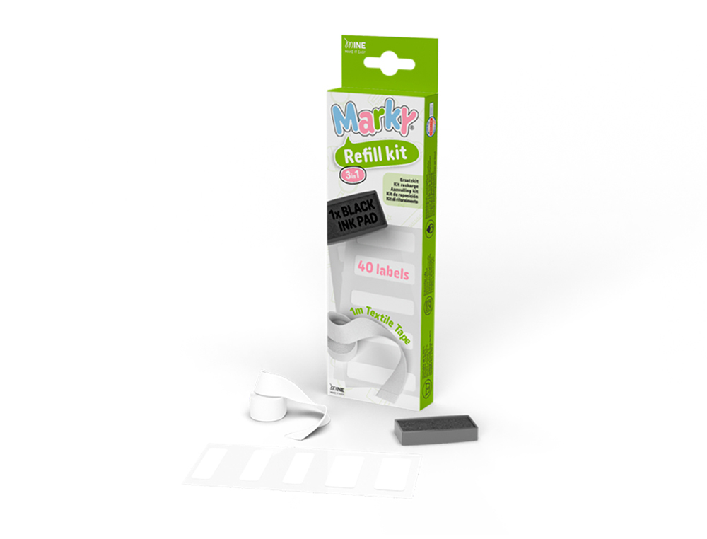Descripción detalladaEl kit de recarga 3 en 1. Contiene una almohadilla de tinta negra, 1 metrode cinta de planchar para tejidos oscuros y 40 etiquetas adicionales en d os tamaños diferentes.