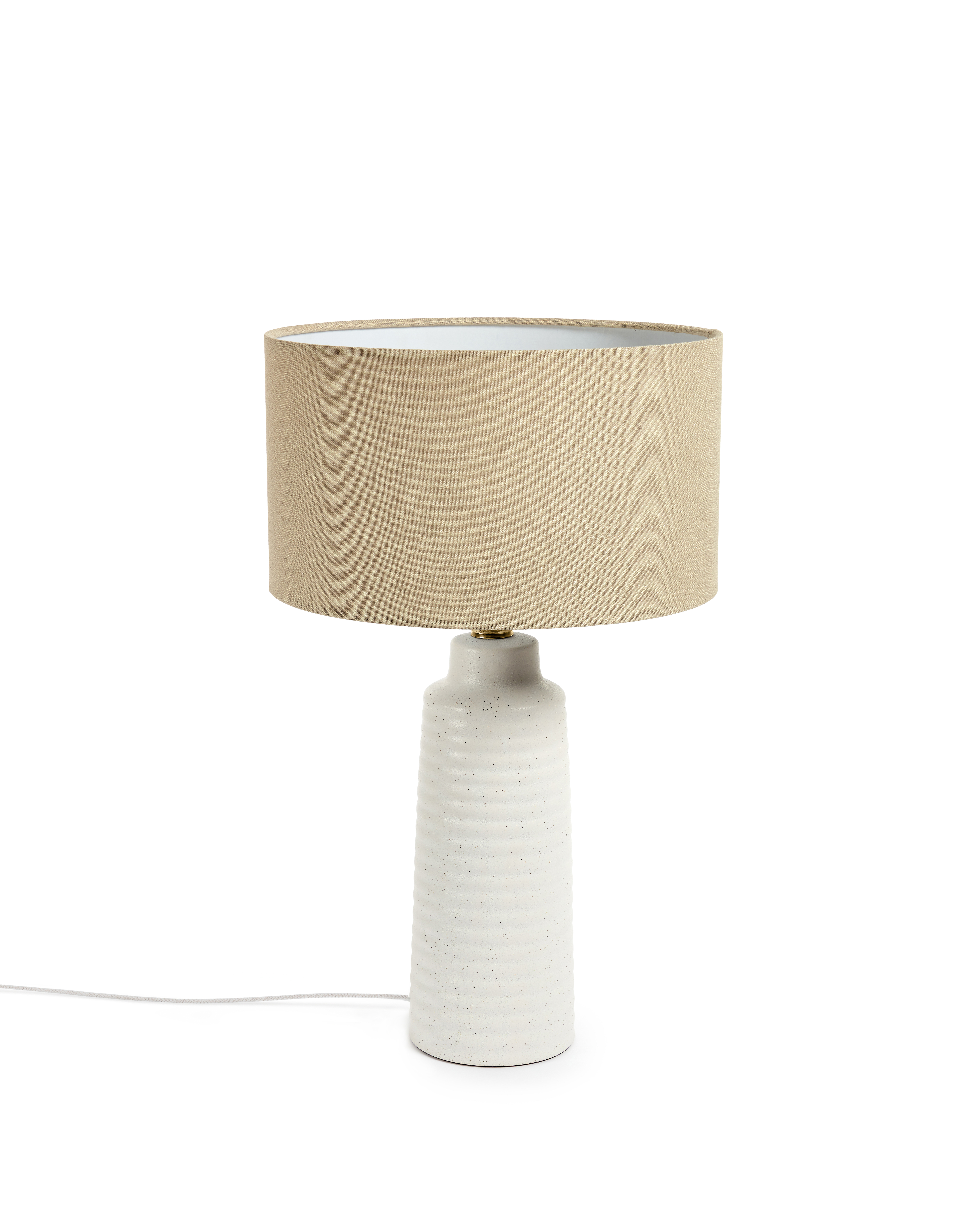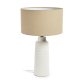 Unimos iluminación y diseño en la lámpara de sobremesa Mijal de cerámica con acabado blanco y pantalla de lino. Su diseño se inspira en la decoración natural y le añade un toque único. Haz que tu decoración hable de ti.