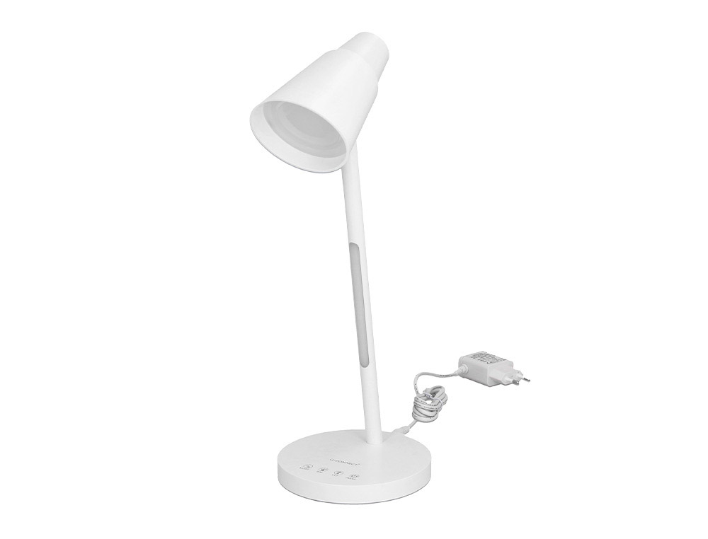 Lámpara de escritorio Q-Connect. Fabricada en ABS y aluminio con acabado mate. Potencia de 6W, 32 LEDs y un flujo luminoso de 360 lúmenes. Temperatura de color (CCT) ajustable: 3000K (luz cálida), 4000K (luz neutra) y 6300K (luz fría), con un índice de reproducción cromática (CRI) de 80 para unailuminación precisa. Sensor táctil para encendido/apagado. Incluye funció n luz nocturna para ambientes relajados. Cabeza orientable con 1 articulación. Cable de 130 mm. Certificados CE y RoHS. Medidas 146x132x297 mm. Peso698 gramos.)