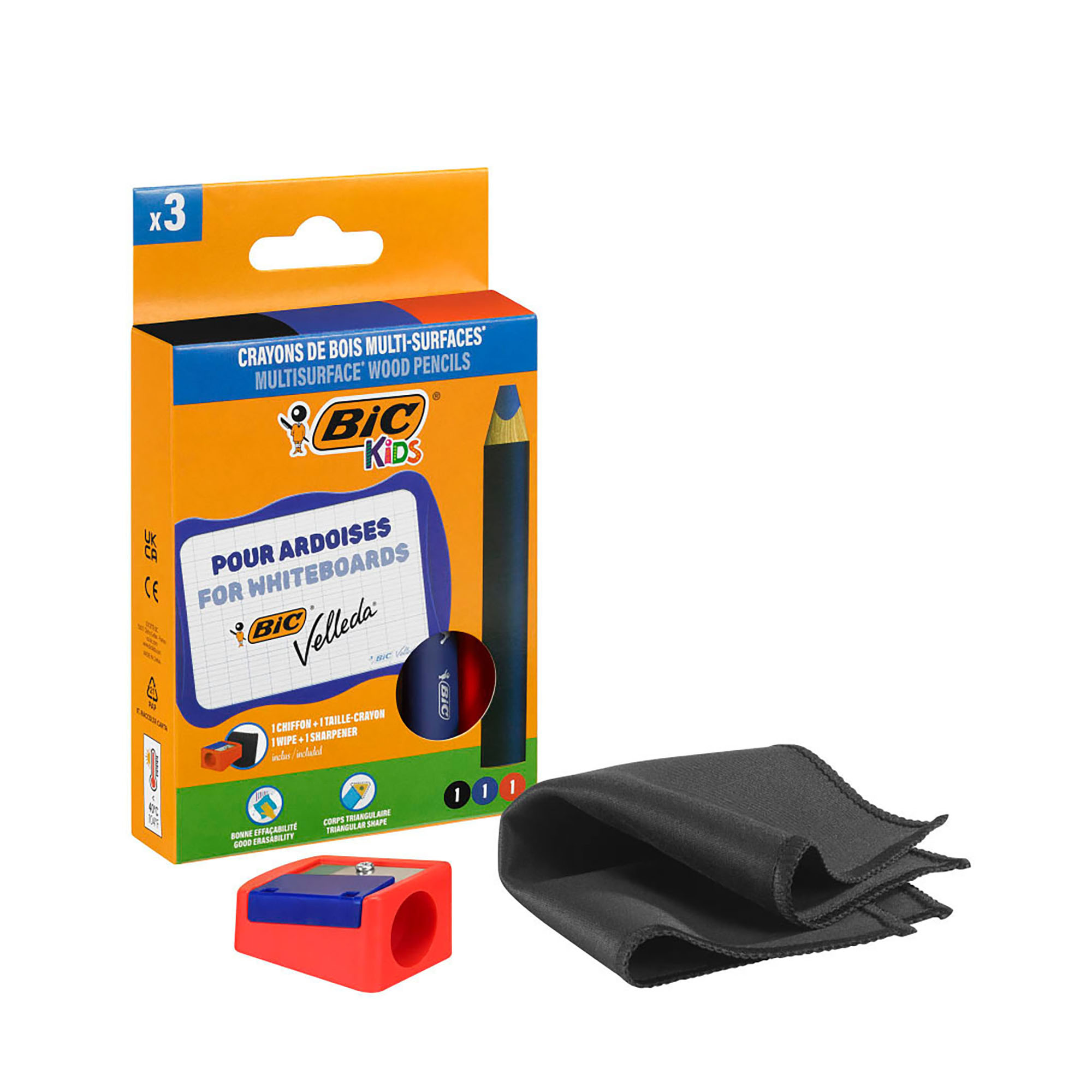 Con sus vibrantes colores (azul, negro y rojo), escribe, dibuja y borra fácilmente en una variedad de superficies. Su forma triangular proporciona un agarre cómodo, el sacapuntas incluido garantiza líneas nítidas y uniformes, y el borrador se limpia fácilmente, ya sea húmedo o seco. Perfecto para pizarras blancas.