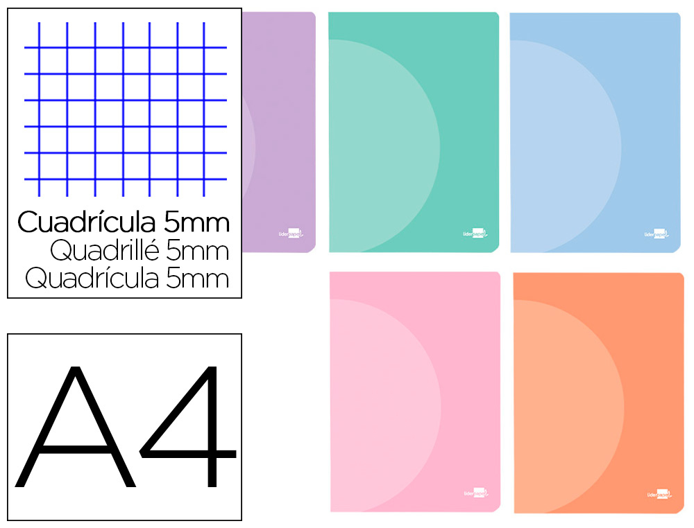 Libreta liderpapel 360 tapa de plastico a4 48 hojas 90gr cuadro 5mm con doble margen colores pastel