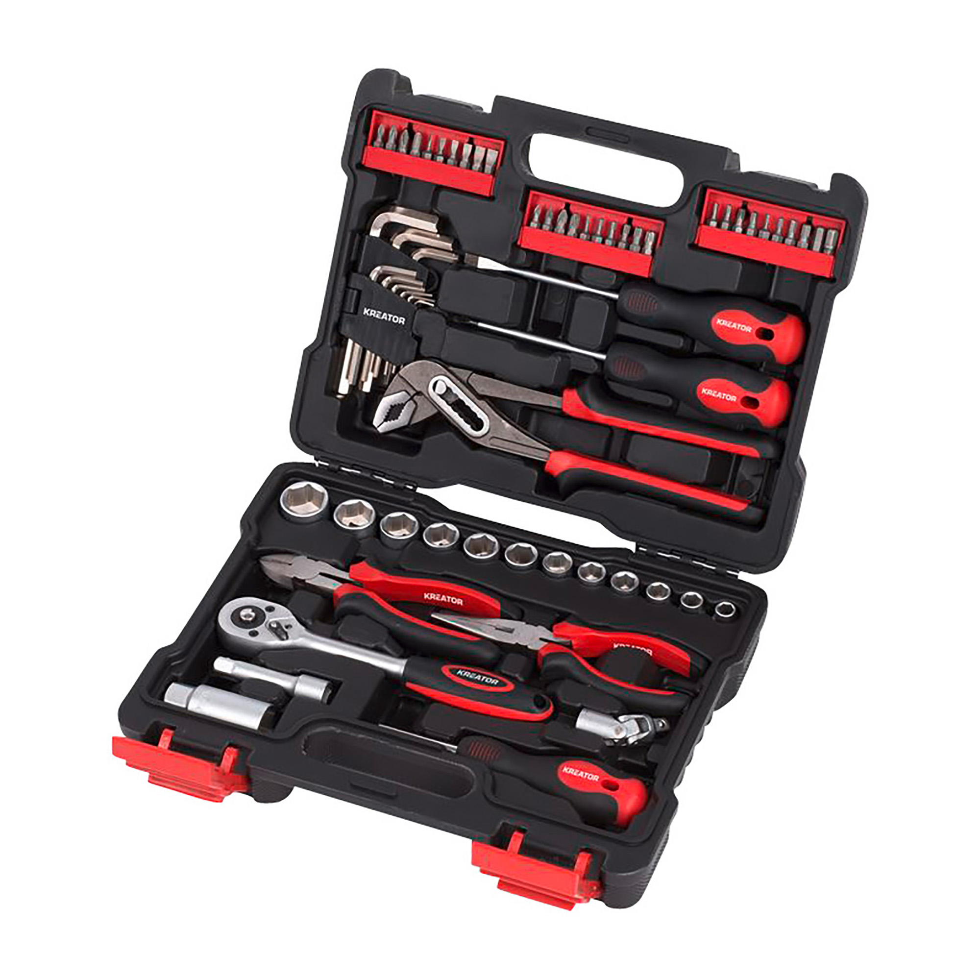 Contiene destornillador plano, de cruz, con cabeza hexagonal, perico, llave de vaso, pinzas estándar, de punta, etc...