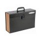 Práctico y cómodo formato tipo maletín con cierre de seguridad con click. Fabricado en una resistente estructura reforzada. 19 secciones para guardar y organizar los documentos. Tira de velcro en la base que permite una mayor apertura para una mejor introducción y manejo de los documentos. Color exterior negro e interior kraft.