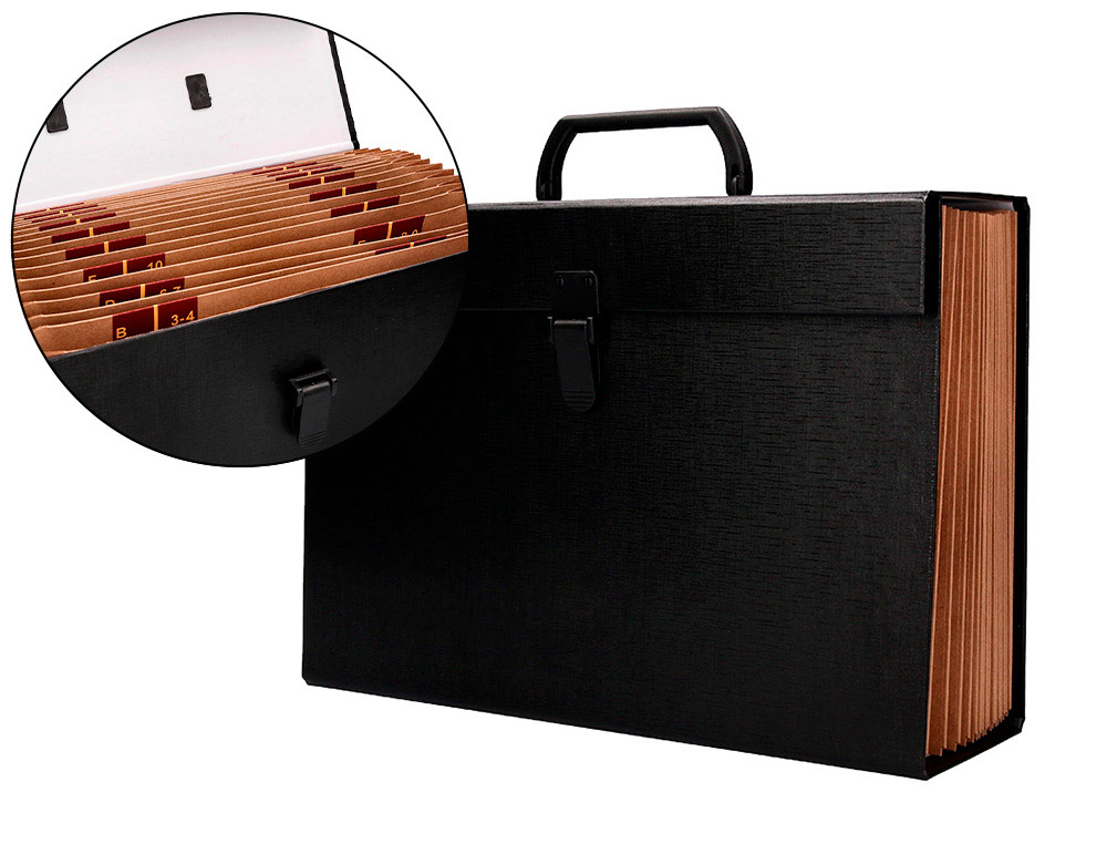 Descripción detalladaMaletín con apertura tipo acordeón. Con 19 departamentos y cerradura con broche. Fabricado en cartón forrado exterior de 2,5 mm. Departamentos interiores de 2,2 mm. Medidas: 390 x 255 x 120 mm. Color negro.