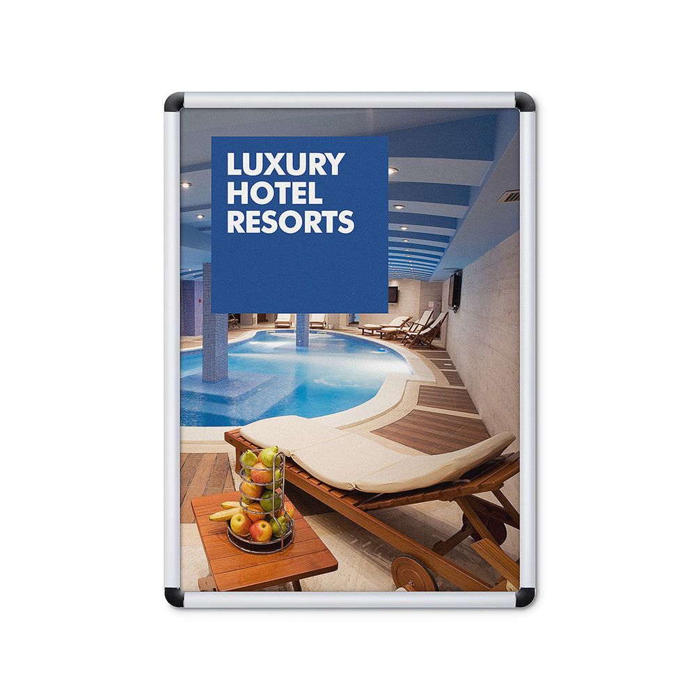 Perfil de diseño sencillo y delgado, perfecto para fijación en paredes. Los perfiles cuentan con esquinas en corte a inglete y los marcos se entregan en empaques individuales. Es la opción ideal para exhibir gráficos desde tamaño DIN A5 hasta DIN A1.