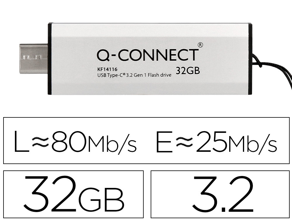 La memoria Q-Connect USB flash drive de 32GB con conexión USB 3.2 Gen 1 tipo C. Ofrece velocidades de lectura de hasta 80MB/seg y de escritura de hasta 25MB/seg. Compatible con Windows y Mac, este dispositivo cuenta con uncuerpo deslizante que protege el conector cuando no está en uso. Su diseñ o plateado y la compatibilidad con versiones anteriores de USB 2.0 lo hacen versátil y práctico. Además, cumple con normativas y certificaciones como CE, UKCA y WEEE.