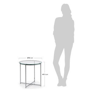 Mesa auxiliar con sobre en cristal templado transparente y pies de acero cromado.- Mesa redonda con sobre de Ø50 cm hecho de cristal templado de 6 mm de grosor, más resistente y duradero que el cristal común.