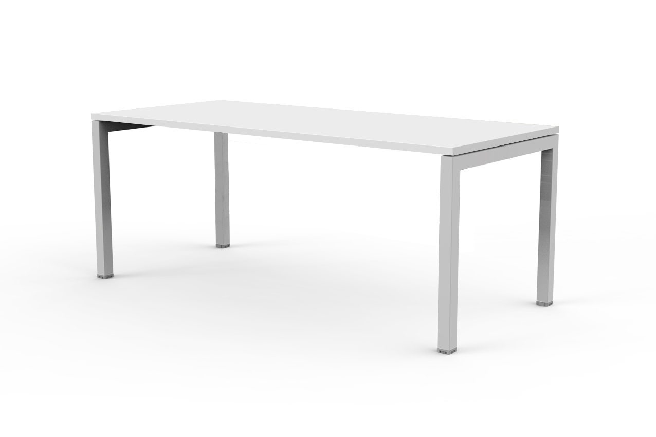 Mesa escritorio 140 Presto-venere fondo 60 blanca. Patas metálicas y sobre o encimera blancas. Sobre melamina antibacteriana 22mm de grosor con cantos abs 3mm grosor. Patas metal cuadrada 40x40 con viga central. Madera reciclada . Tablero elevado sobre patas para romper barreras visuales y poder pasar cables.
