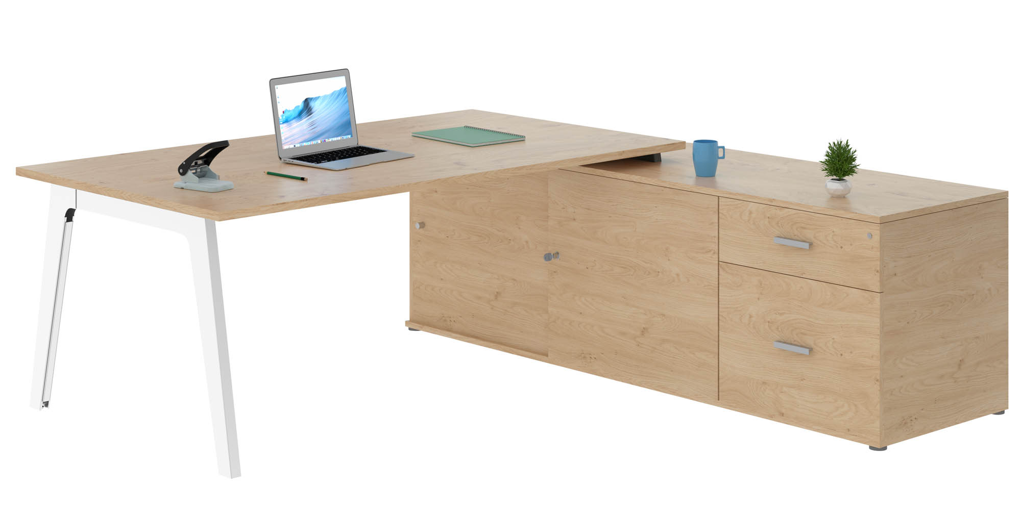 Descripción detalladaCombina modernidad y practicidad con la gama edén Arco.Composición: Tablero de de partículas melaminadas grosor 25 mm . Viga de refuerzo con pasacables sección 35 x 25 mm. Cantos ABS antigolpes grosor 3 mm. Patas metálicas autoportante inclinada con pasacables cerrados por cárter extraíble ABS.El tablero cuenta con una parte precortada para la colocación de pasacables Ø 80 mm.Extensión a la izquierda o a la derecha, con 2 compartimentos, cada uno 1 tableta extraíble. Puertas correderas con cerradura (2 llaves incluidas). Tiradores de aluminio cepillado. Cajonera integrada con 2 cajones, 1 de ellos para carpetas colgantes.Dimensiones:Dimensiones tablero: Alt 72,5 x An 180 x Fon 100 cm.Dimensiones extensión: Alt 69 x An 200 x Fon 60 cm.Accesorios opcionales: Panel de fondo (Referencia: 57274 melaminado antracita y 94871 en metacrilato blanco).Canaleta pasacables gama edén Arco (Referencia: 707872).Pasacables redondo Ø 80 mm - negro (Referencia 774579) o blanco (Referencia: 44413).Regleta empotrable con tapa corredera 1 toma de corriente + 1 puerto RJ45 + 1 puerto USB (Referencia: 711385).Completa tu diseño con el almacenamiento de las gamas edén o edén Arco.Montaje:Entregado desmontado. Montaje opcional.Normas y medio ambiente: Este producto es respetuoso con el medio ambiente, ya que está fabricado con un mínimo del 50 % de material reciclado.
