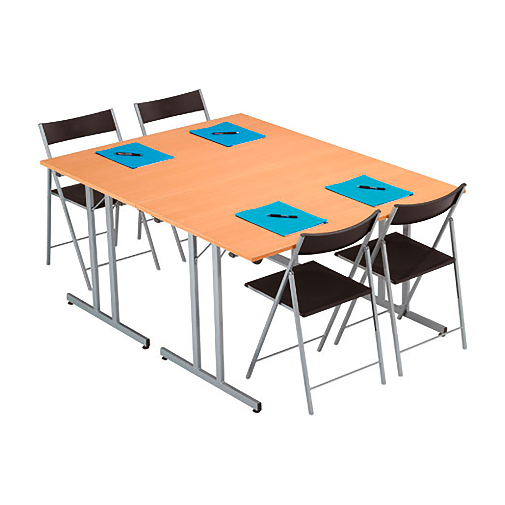 Mesa plegable y apilable con fijación de seguridad en posición abierta y cerrada.
