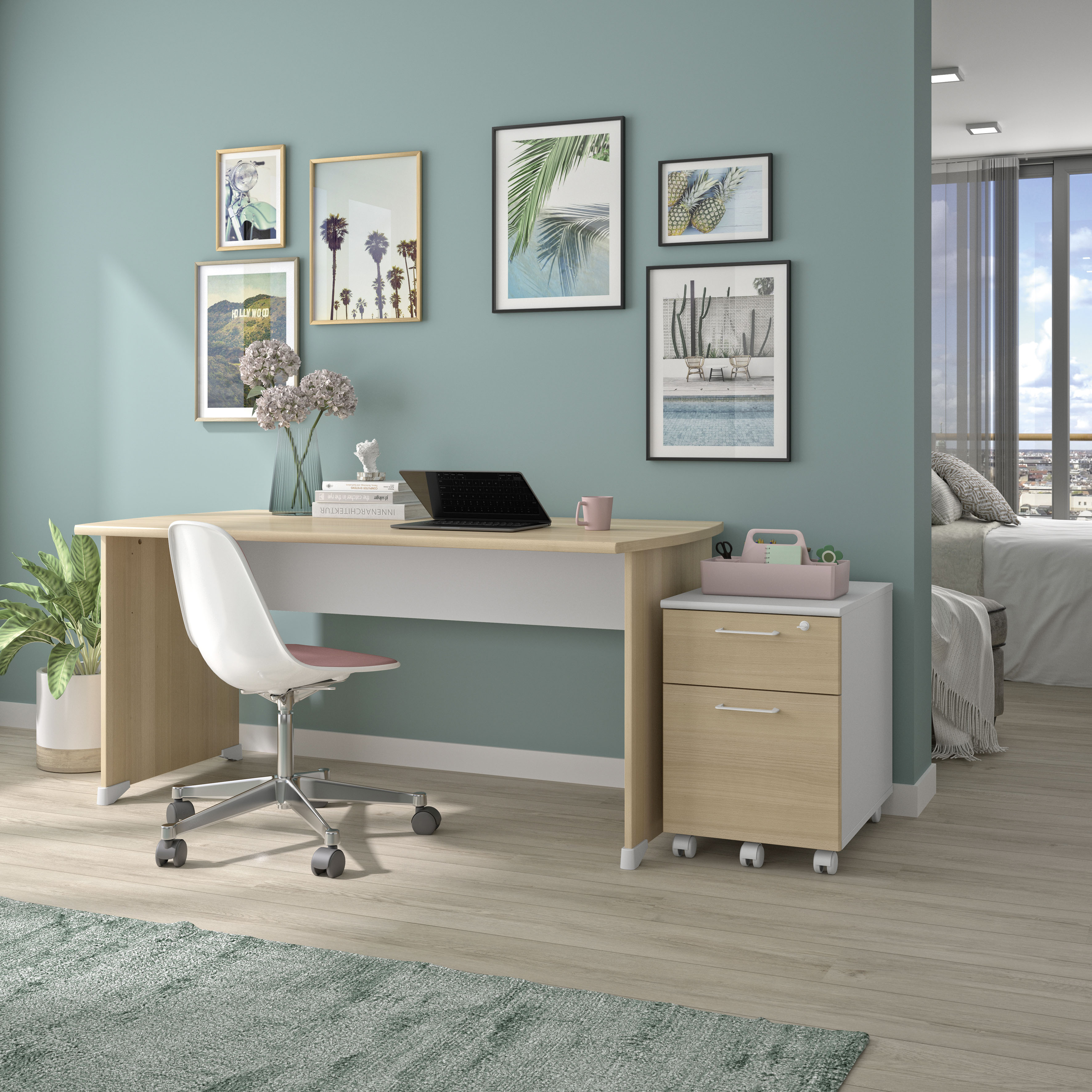 Estructura: paneles de partículas de alta densidad, tablero grosor 25 mm. Revestimiento melaminado acabado aliso o haya y roble. Cantos semirredondos.