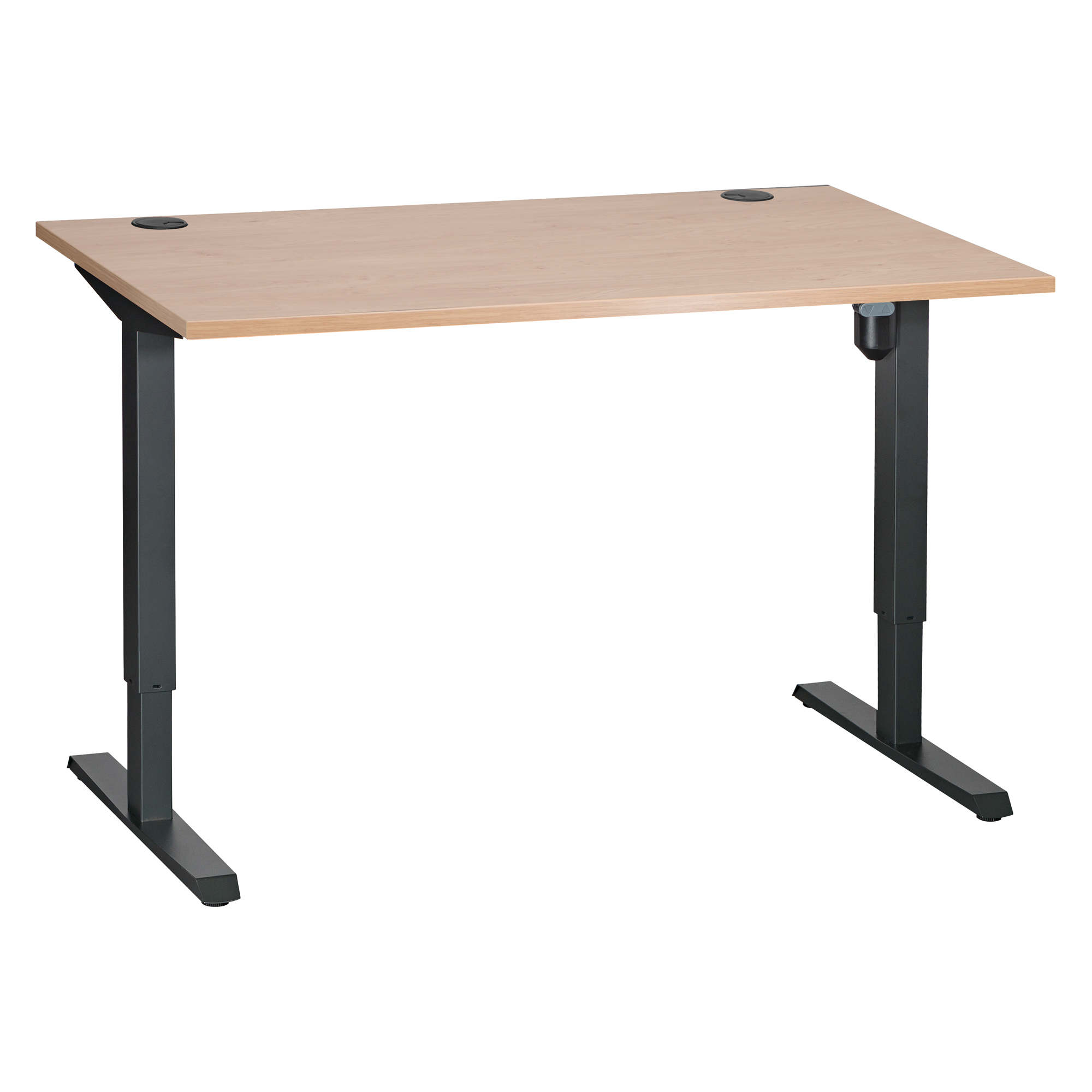 Tablero de paneles de partículas melaminado de 25 mm de espesor, canto antichoque de 2 mm de espesor. Pata en T de metal de carbono con estructura de viga. Tacos de regulación en altura. Tablero regulable en altura de 70 a 119 cm gracias a un pistón motorizado. Botón de mando eléctrico para posicionar en el montaje, a la derecha o a la izquierda en la parte frontal del tablero