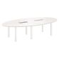 Estructura: tablero de paneles de particulas melaminada , grosor 25 mm. Mesa modular: formada por 2 tableros semi ovalado con 1 caja pasacable en cada parte para poner regleta. Medidas: Alt 72 x An 280 x Fon 140 cm 6 Patas metálicas autoportante, sección cuadrado 60 x 60 mm, con parte alta cromada Extensión opcional para alargar la superficie.