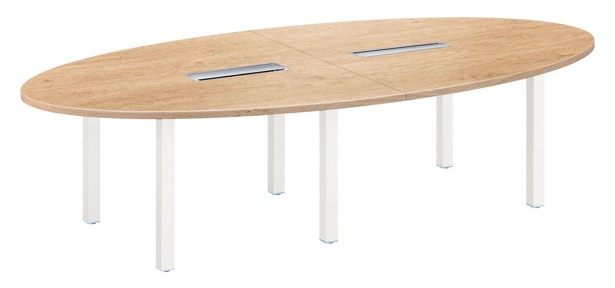 Mesa modular: formada por 2 tableros semi ovalado con 1 caja pasacable en cada parte para poner regleta. Medidas: Alt 72 x An 280 x Fon 140 cm