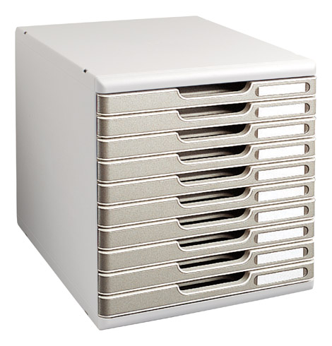 Módulos de clasificación apilables y ajustables mediante clips, para crear verdaderas paredes de clasificación. Para documentos hasta formato 24 x 32 cm. 4 alturas útiles de cajón: de 2,6 cm a 11 cm. Cajones intercambiables suministrados con portaetiquetas y etiquetas. Cuerpo gris claro con esquinas redondeadas. Fabricado en Poliestireno. Medidas de un módulo: Alt. 32,5 x An. 29 x Fon. 35 cm.
