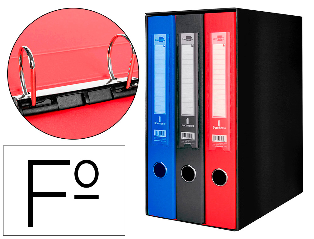 Fabricado en cartón entrecolado de 1,90 mm de espesor forrado con papel deencuadernación plastificado y gofrado con tela de PVC. 2 anillas mixtas d e 40 mm con compresor de plástico, cantoneras largas, ollao y tarjetero enel lomo. Tamaño folio. Medidas exteriores del módulo: 184 mm ancho x 350 mm alto x 290 mm fondo. Ancho de lomo: 60 mm. Colores surtidos, la forma más cómoda de tener la documentación de varios asuntos perfectamente clasificada y separada por color.