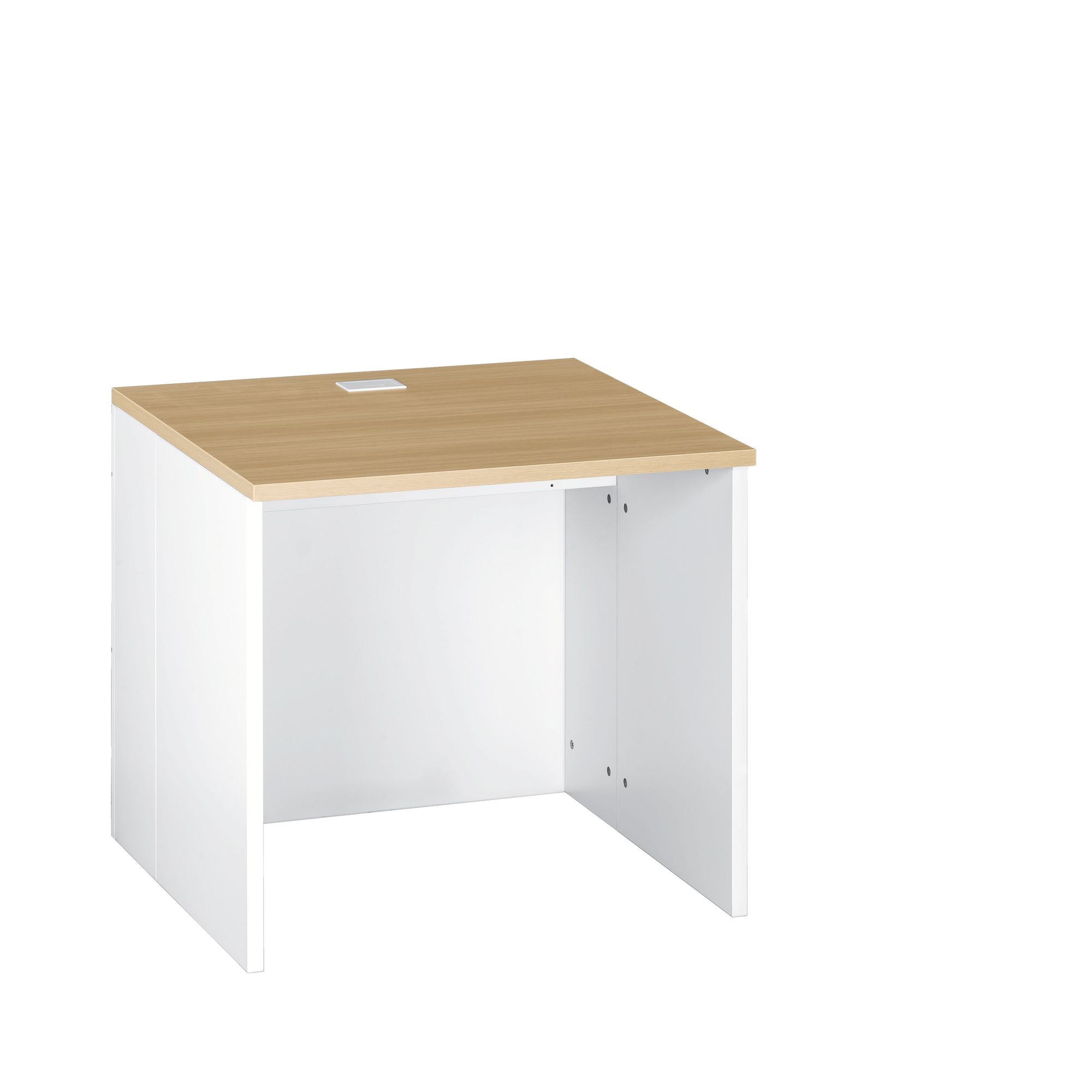 Estructura: paneles de particulas melaminadas grosor 25 mm. Cantos ABS grosor 2 mm. Tablero y encimera color roble claro o aluminio. Cuerpo blanco con lineas color aluminio. Mostrador con tablero recto y pasacables