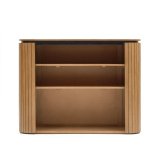 El equipo de Kave Home ha creado la colección Mailen, con un diseño contemporáneo de formas redondeadas, fabricado en chapa de fresno y puertas correderas de listones de madera que la convierten en la auténtica protagonista.- Mueble de TV hecho de chapa de fresno con acabado oscuro.