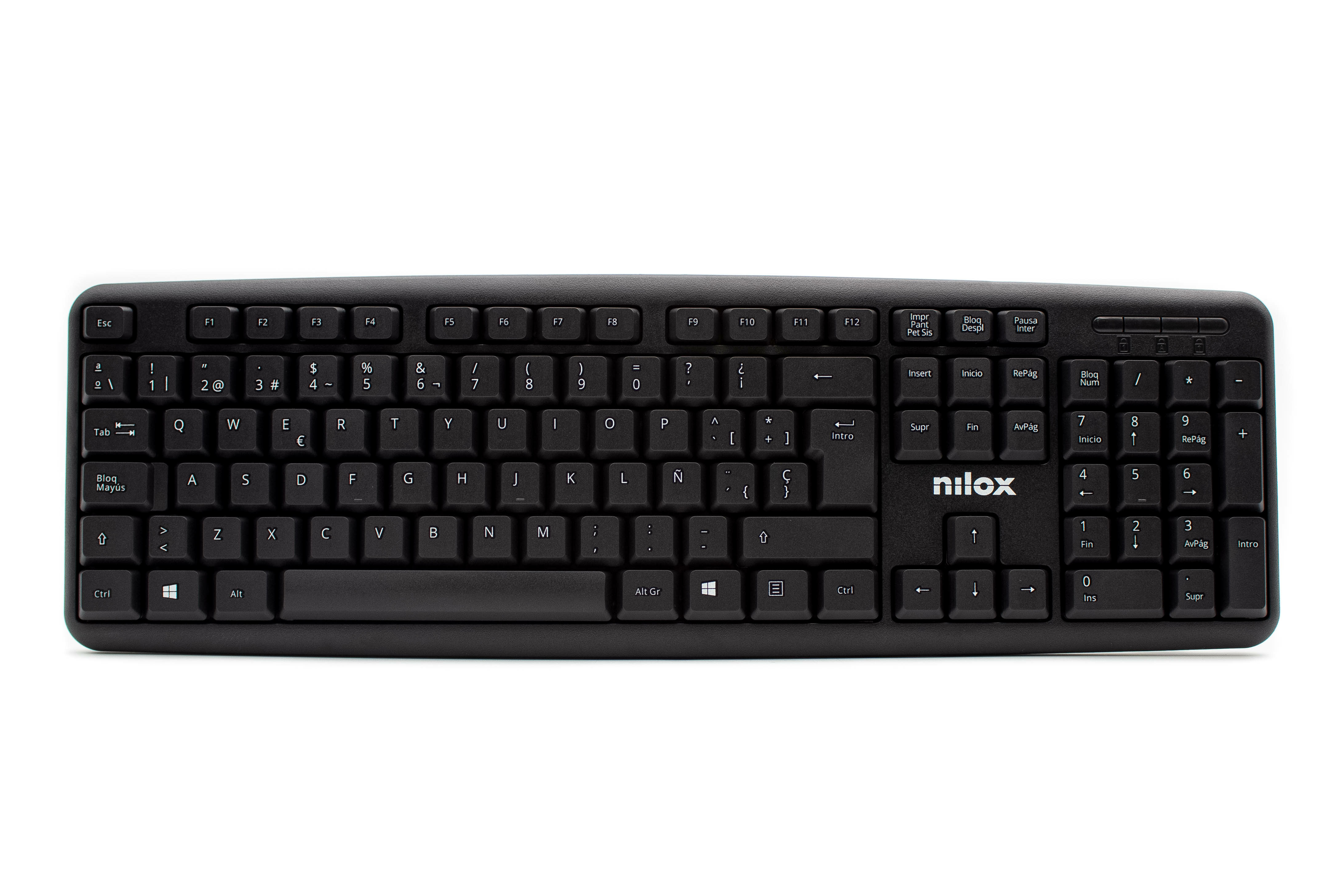 Nilox TECLADO USB ESP. Formato del teclado: Completo (100%). Estilo de teclado: Derecho. Tecnología de conectividad: Alámbrico, Interfaz del dispositivo: USB, Interruptor del teclado: Interruptor de membrana, Diseño de teclado: QWERTY, Teclado, cantidad de teclas: 105, Uso recomendado: Universal. Color del producto: Negro
