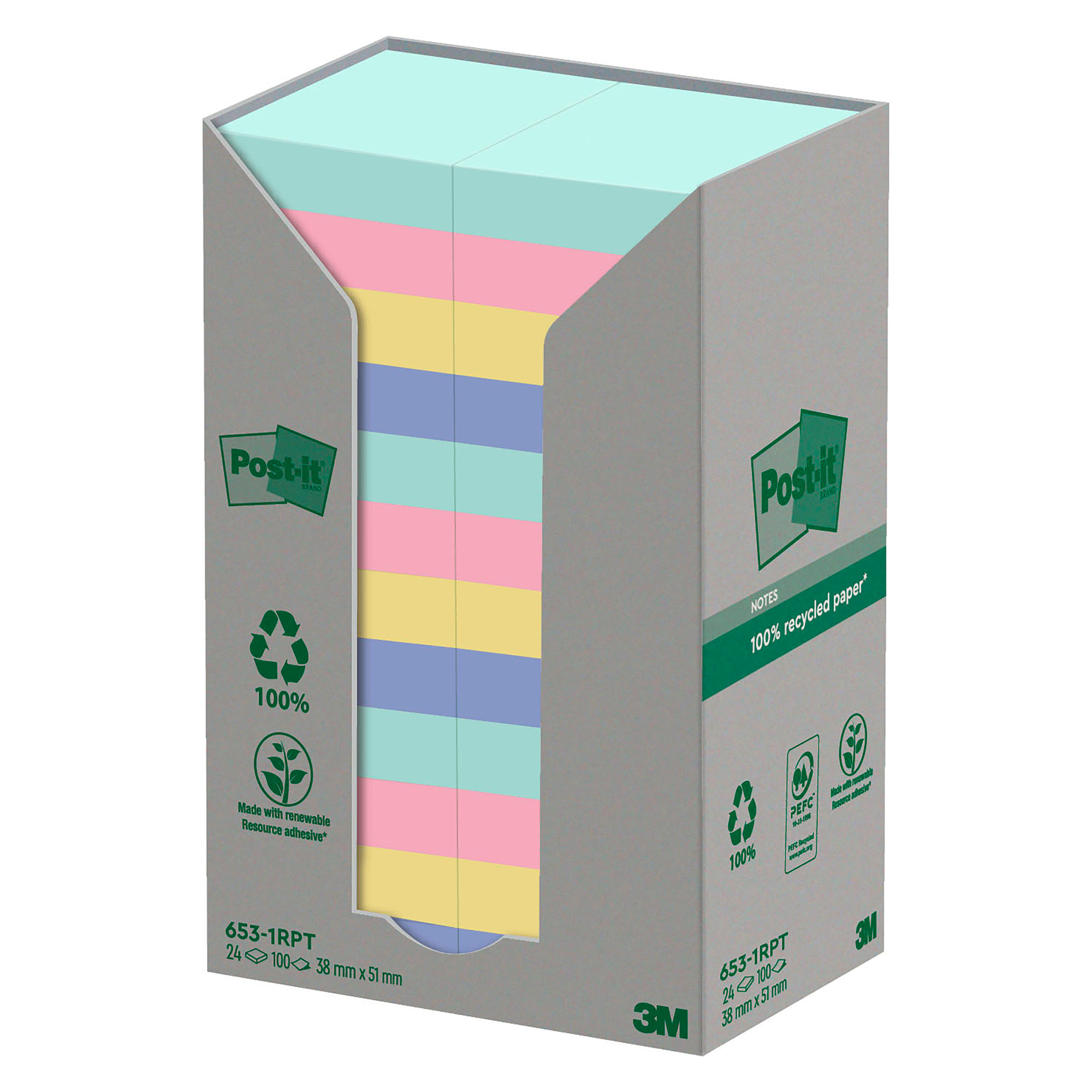 Descripción detalladaTorre de notas adhesivas ecológicas Post-it® Notas Recicladas. Surtido de colores Nature: menta, rosa, amarillo y violeta.Se entrega en un Pack Torre con 24 blocs en colores surtidos.Formato 38 mm x 51 mm.Bloc de 100 hojas. 100% Papel reciclado.