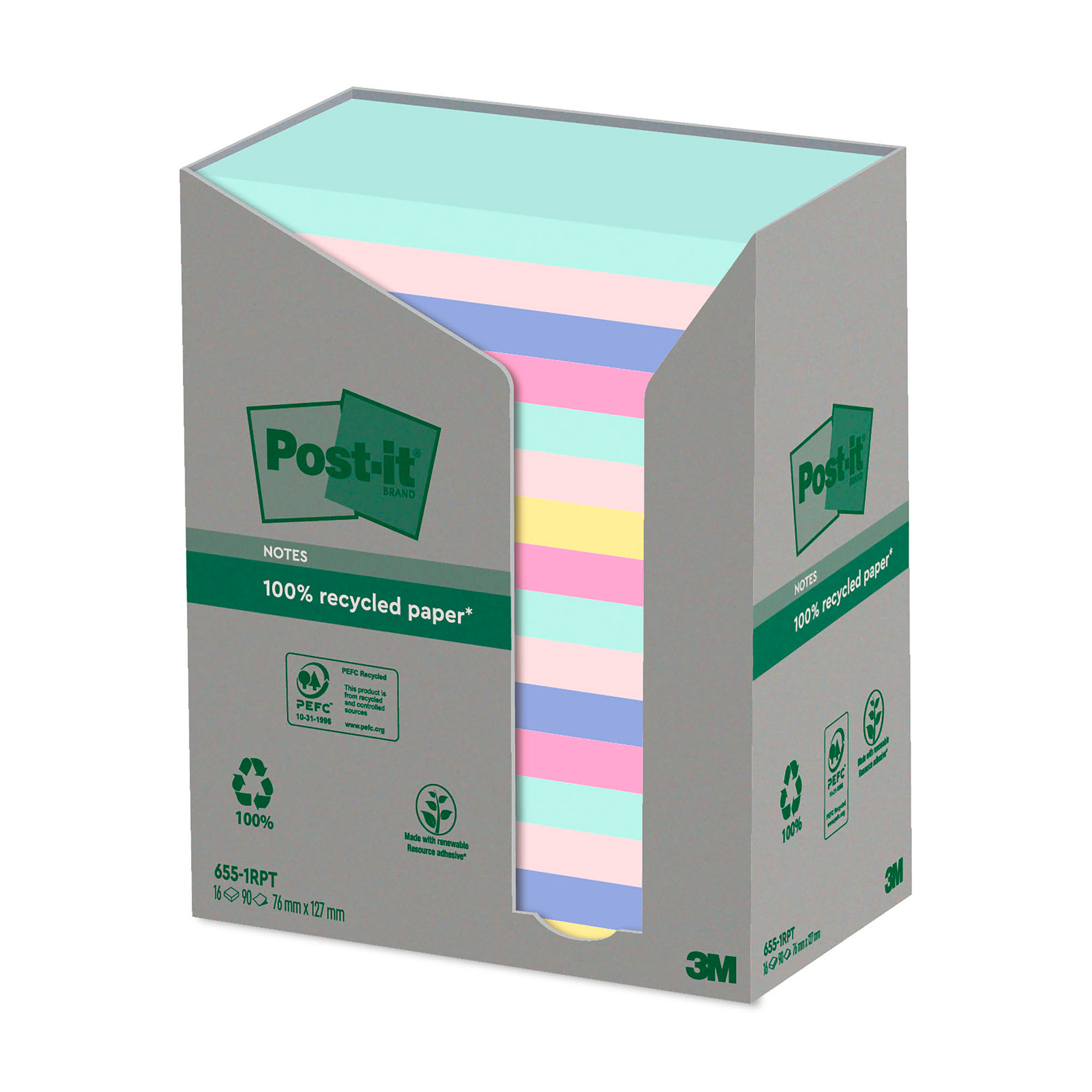 Torre de notas adhesivas ecológicas Post-it® Notas Recicladas. Surtido de colores Nature: menta, rosa, amarillo y violeta.