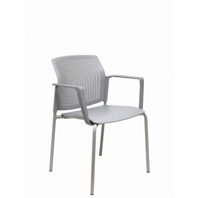 Respaldo ergonómico para una mejor adaptación a la espalda con acabado perforado en PVC. Asiento ergonómico para una mayor comodidad del usuario de PVC. Brazos fijos de serie. Estructura de hierro en color gris. Apilable. Para pedidos superiores a 32 unidades de sillas, consultar precio
