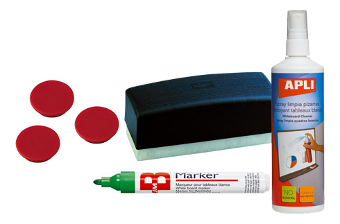Descripción detalladaPráctico pack de accesorios para pizarra blanca formado por:4 rotuladores para pizarra (azul, negro, rojo y verde)1 borrador magnético1 pack de 3 imanes rojos1 spray limpia pizarras.