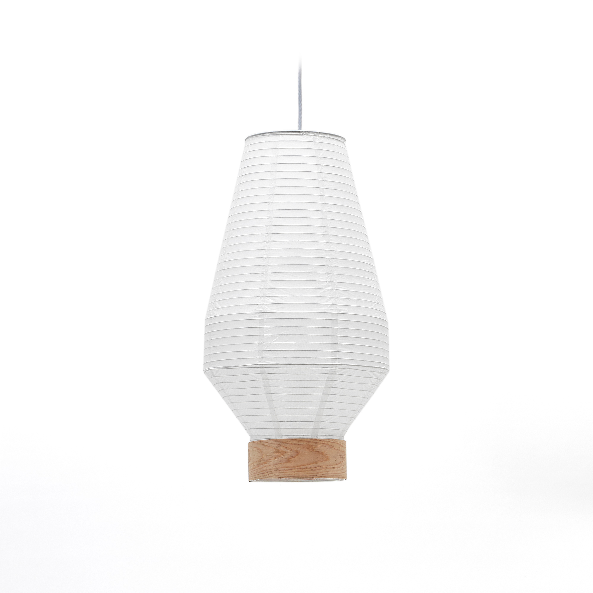 Pantalla para lámpara de techo hecha con papel blanco y chapa de madera con acabado natural.