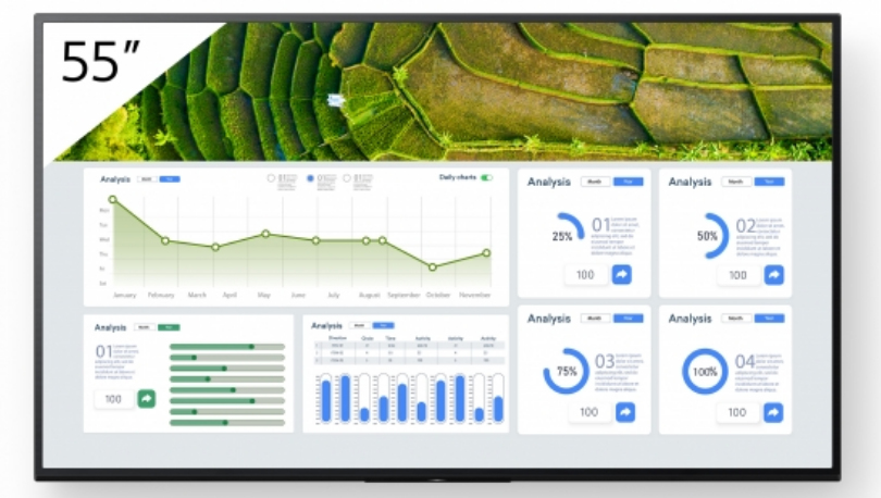 Sony FW-55BZ30L. Diseño de producto: Pantalla plana para señalización digital. Diagonal de la pantalla: 139,7 cm (55"), Tecnología de visualización: LCD, Resolución de la pantalla: 3840 x 2160 Pixeles, Brillo de pantalla: 440 cd / m², Tipo HD: 4K Ultra HD. Wifi. Horas de funcionamiento (horas/días): 24/7. Sistema operativo instalado: Android. Color del producto: Negro.