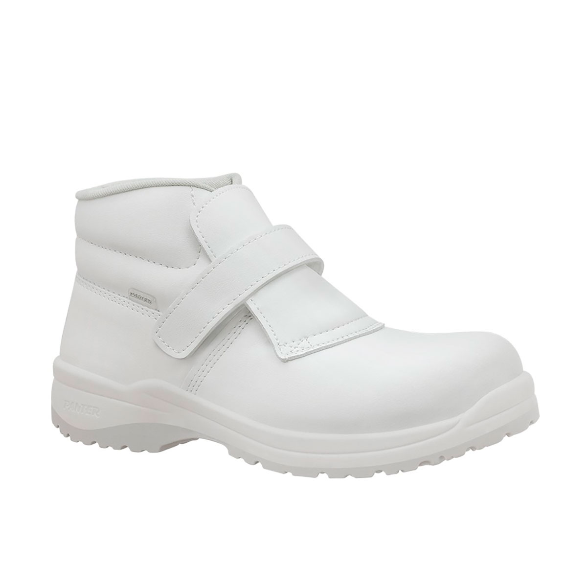 Zapato Merlot S2 blanco con microfibra OEKO-TEX lavable, puntera plástica, suela antideslizante Hidrogrip y cierre por velcro. Cómodo, seguro e higiénico