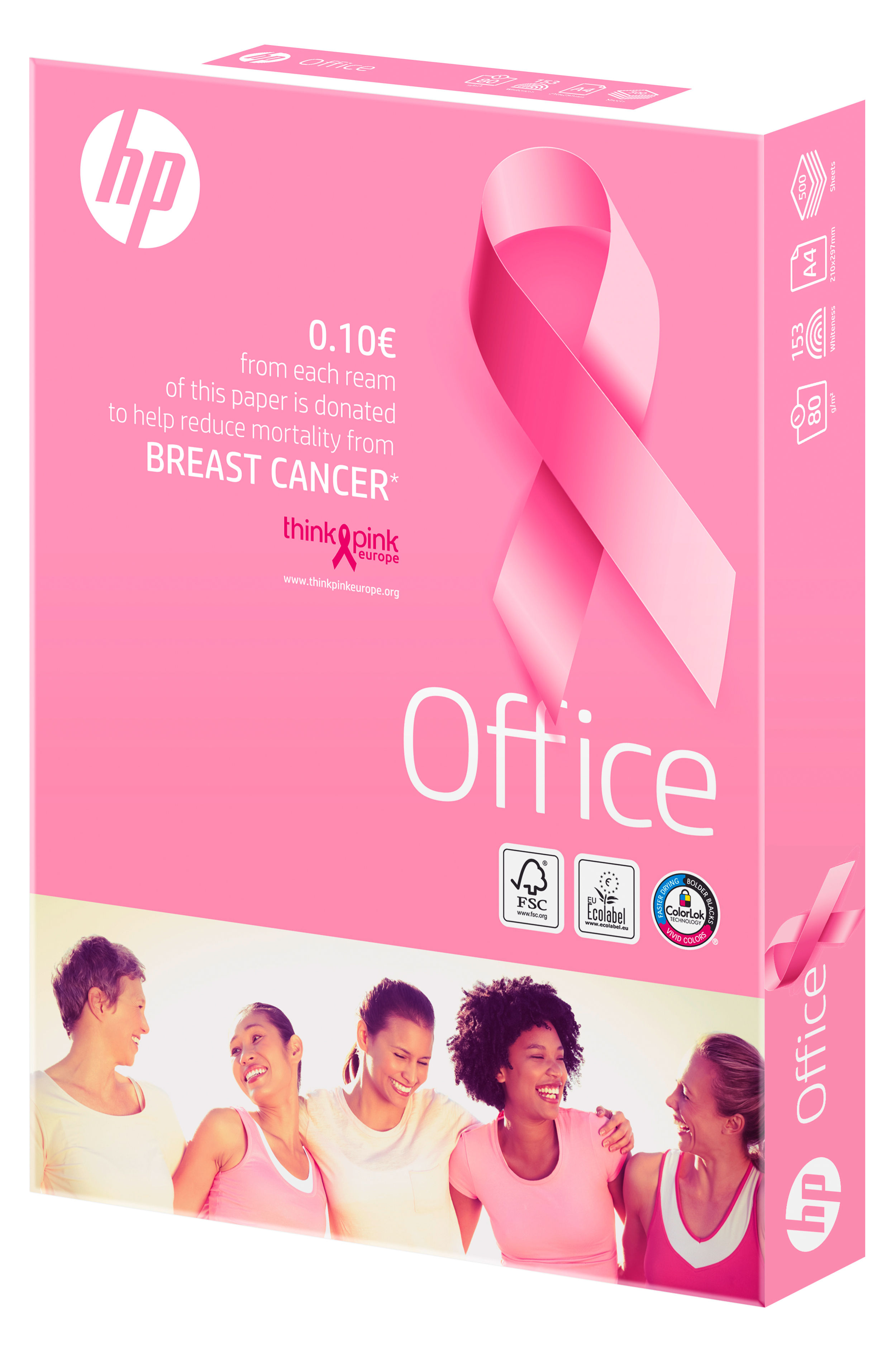 Además con la compra de este producto el fabricante dona 0,10 euros de cada resma Pink vendida a Think Pink Europe, organización sin ánimo de lucro que colabora activamente con organizaciones locales en la sensibilización, la promoción de la prevención y la reducción de la mortalidad por cáncer de mama.