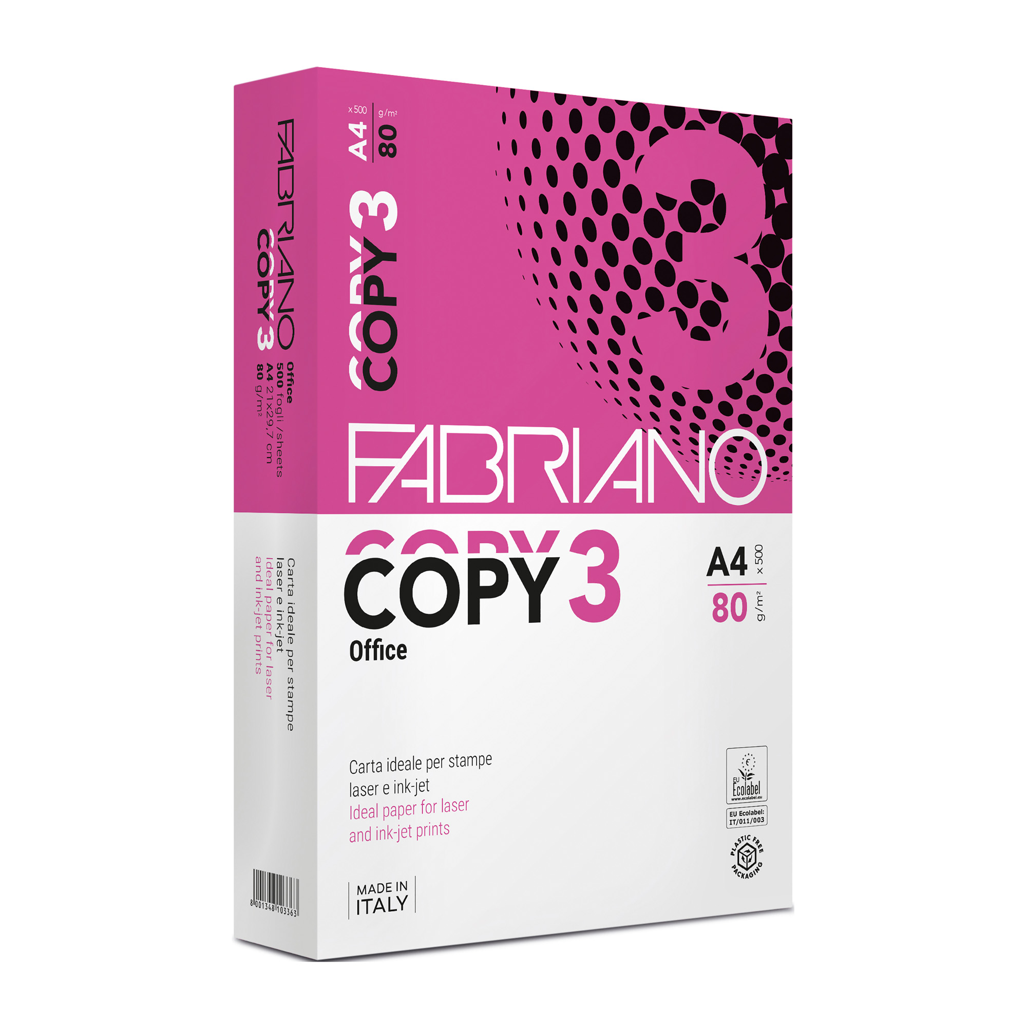 Descripción detalladaPapel Fabriano Copy 3. Formato A4. Papel de 80 g.Papel de calidad para gran cantidad de impresiones o fotocopias.Blancura estandar CIE 147. Paquete de 500 hojas.Certificado Ecolabel.