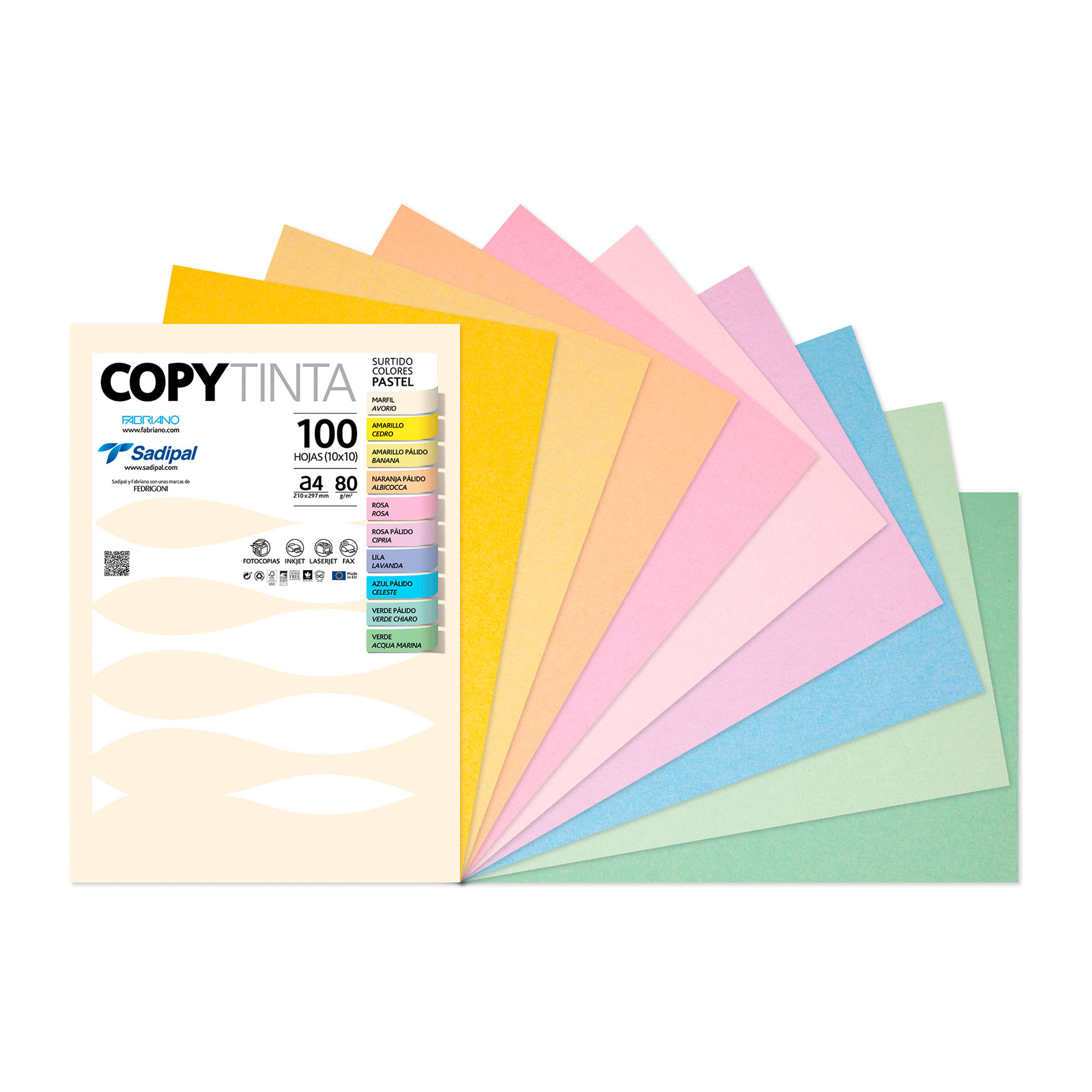 Surtido 10 colores pastel,10 hojas por color: Márfil, Amarillo, Amarillo claro, Naranja claro, Rosa, Rosa claro, Lila, Azul claro, Verde claro, Verde.
