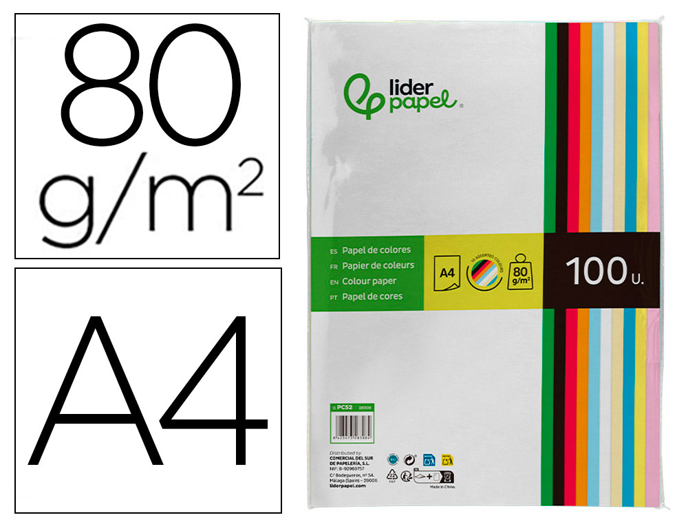 Papel color liderpapel a4 80gr 10 colores surtidos paquete de 100 hojas