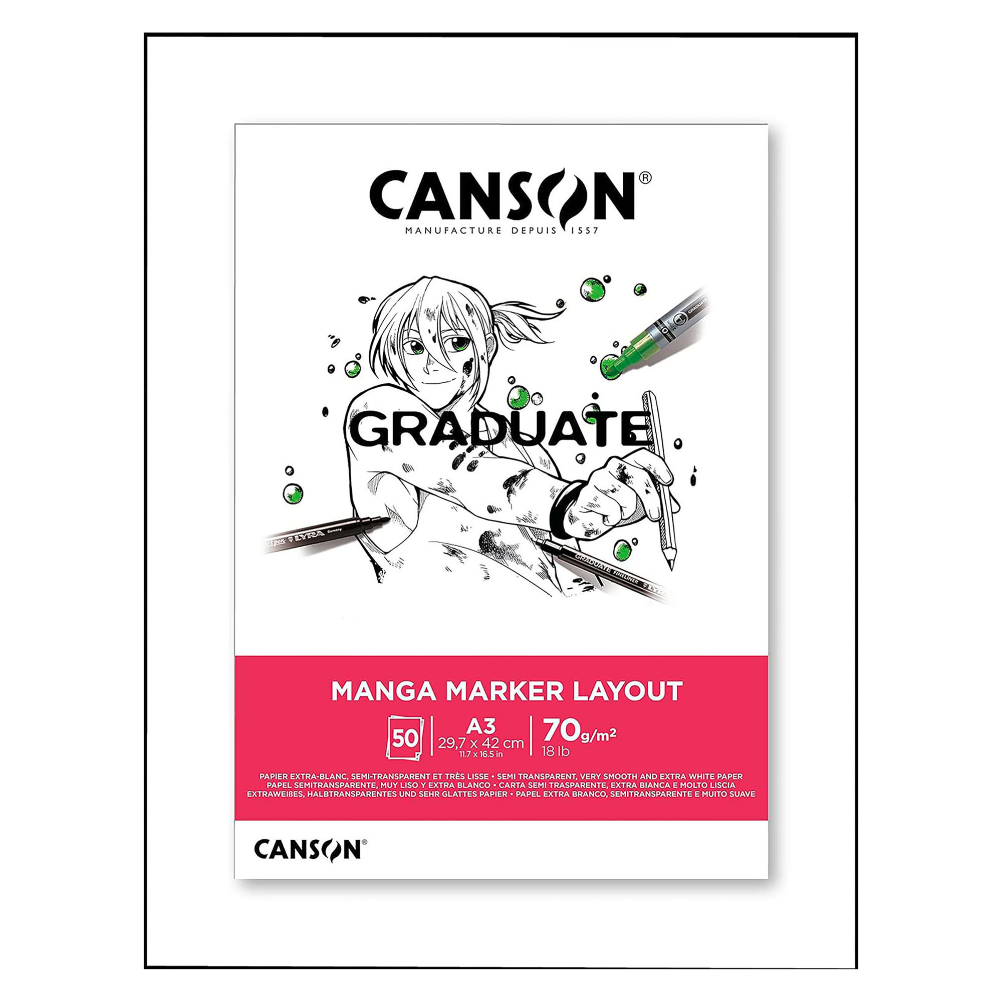 Bloc de papel extra blanco para el layout, medidas 297 x 420 mm, 70 hojas. Tamaño A3. Resistente a los rotuladores con disolventes y agua. Excelente representación cromática,colores lisos aterciopelados. Apto para todo tipo de rotuladores.