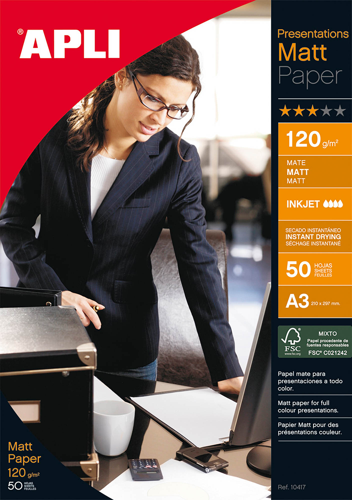 Descripción detalladaIdeal para hacer tus propios pósters.Papel fotográfico para impresoras Inkjet. Acabado mate.Formato A3. Medidas: 297 x 420 mm. Papel foto de 120 gPaquete de 50 hojas.Referencia Apli 04462.
