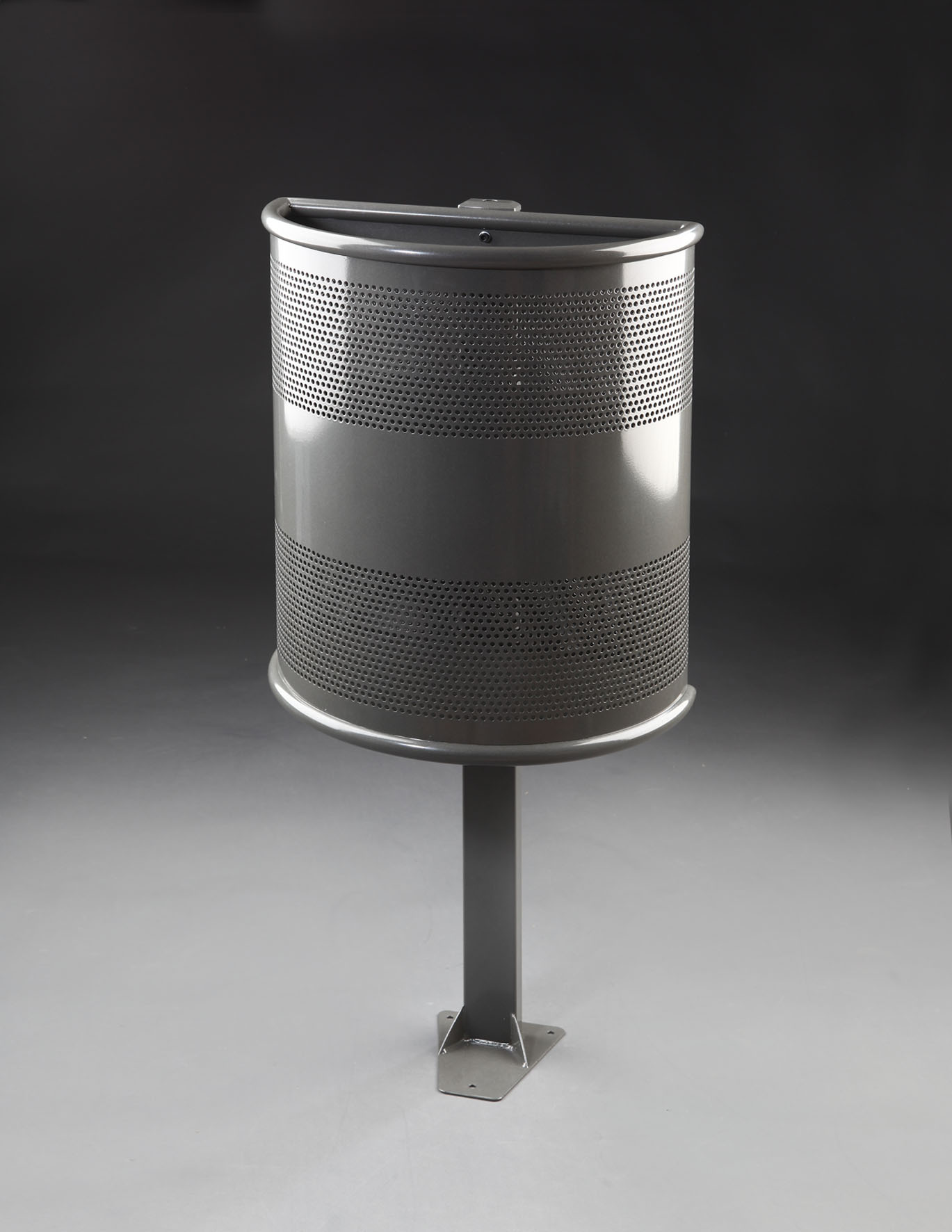 Papeleras exterior. Papelera semicircular chapa perforada 40 L (1/2xØ440mm) basculante sobre soporte a suelo pintada. Fabricada en chapa electrocincada de 1,0 mm de espesor perforada en malla de punzones redondos de Ø5mm. Soporte de tubo de acero rectangular y cierre por llave de cuadradillo. Lacada con pintura poliester de color a elegir. Resistencia a la oxidación testada en prueba de nieblas salinas por encima de las 300 horas. Modelo apropiado para zonas urbanas y parques y jardines