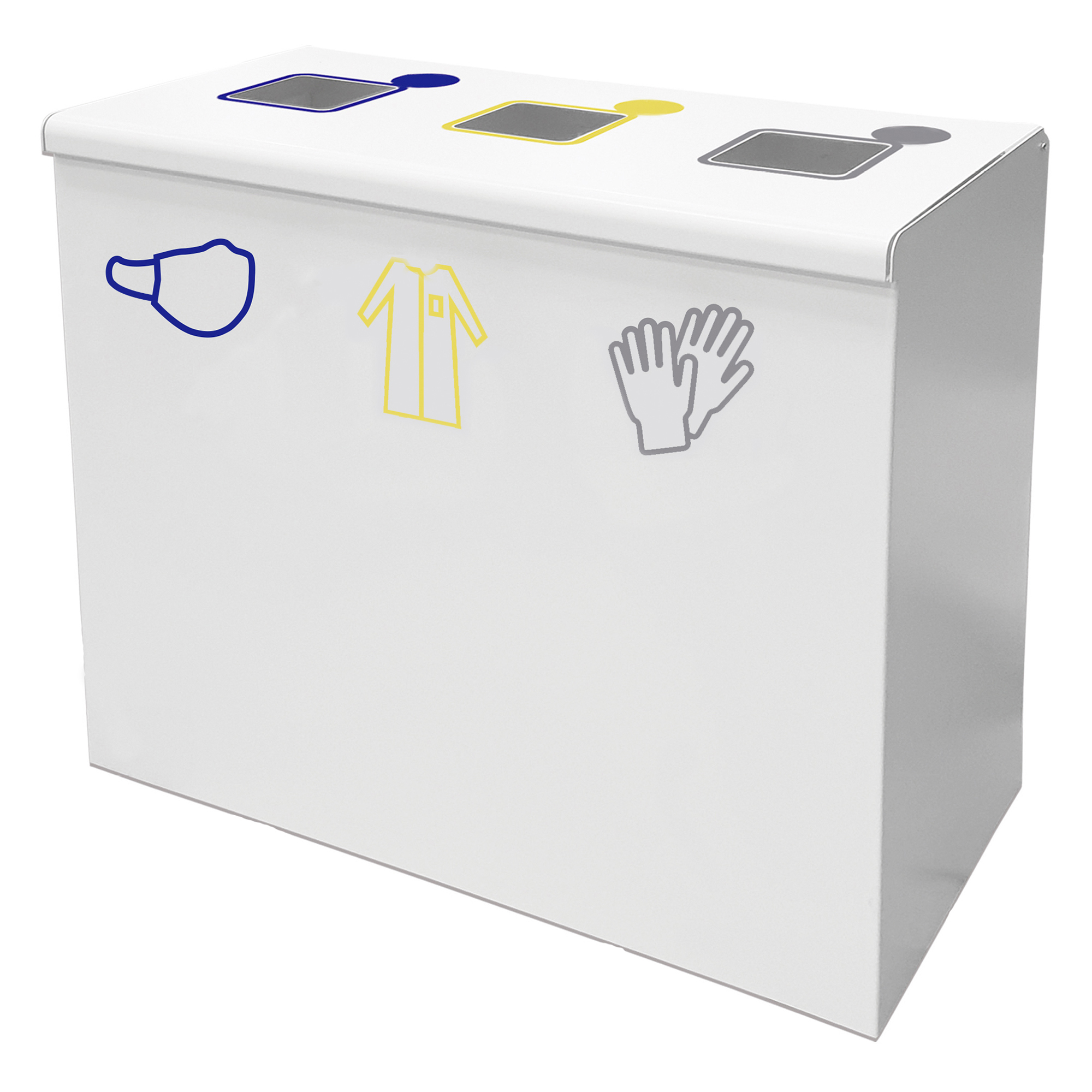 Descripción detalladaContenedor de reciclaje de 120 L de 3 residuos, con tapa abatible y 3 aros interiores para sujeción de las bolsas. Tapa superior con vinilo para la diferenciación de los residuos. Dimensiones : 75 x 36 x 70 cm (120 L).