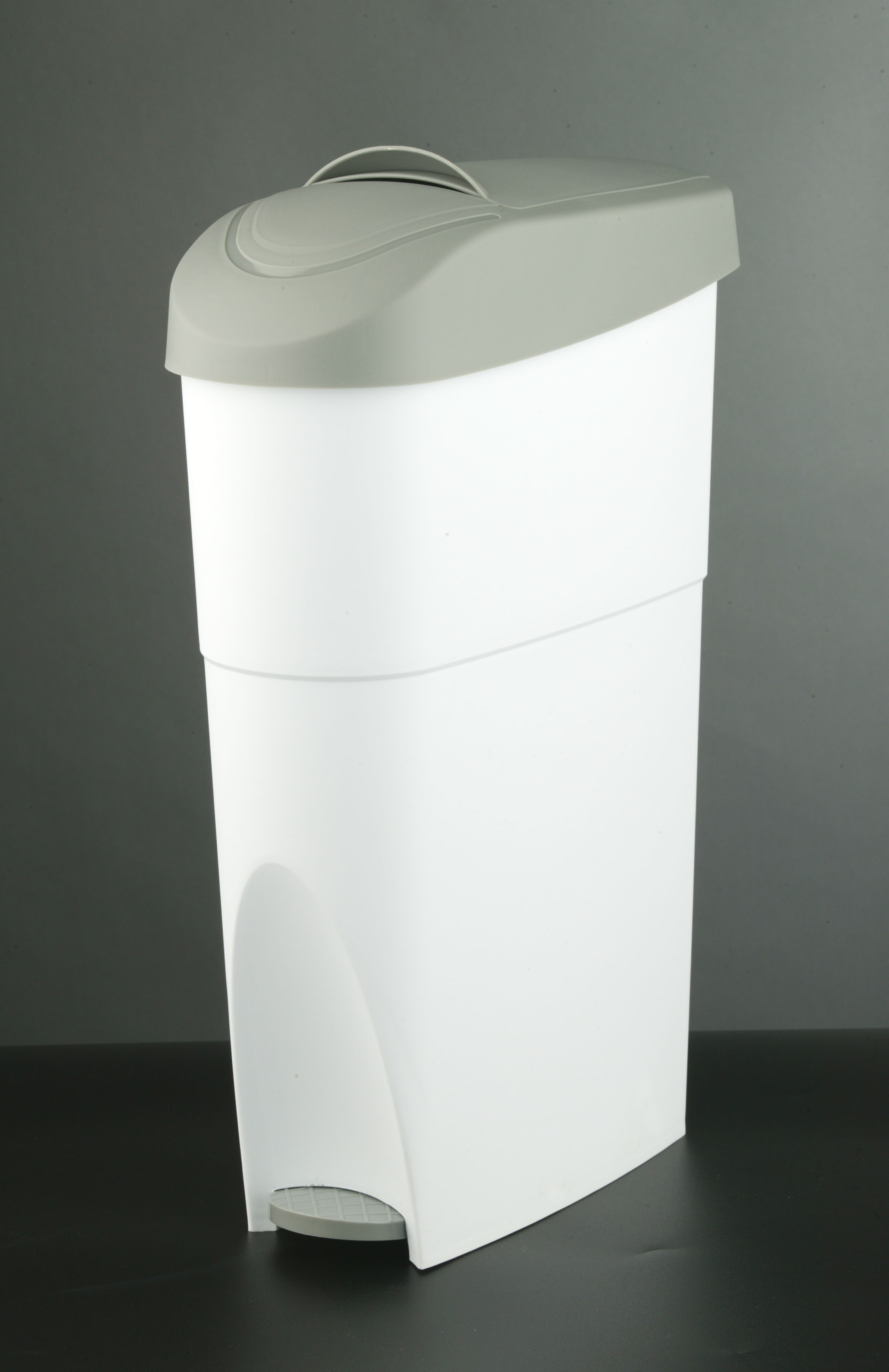 Papelera compresera de pedal y balancín ciego blanca y gris Fabricada en polipropileno y ABS inyectados de alta calidad. Superficie externa texturizada grano fino. Cuerpo con capacidad para 20 litros y cabezal extraíble Cabezal que incorpora un balancín en V interno. Diseño del balancín es tal que impide el acceso directo al interior. Pedal para accionar la apertura del balancín. Cavidad en cabezal para colocar productos higienizantes y/o antiolor