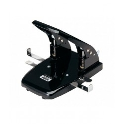 Taladrador metálico grande de 2 perforaciones de 6 mm. de diámetro. Capacidad de perforado: hasta 40 hojas. Palanca de cierre para ahorrar espacio y cubeta de desperdicios. Sistema de doble guía de auto-centrado para centrar cómodamente cualquier tamaño de papel. Se taladra por detrás. Discos antideslizantes. Presentación: caja de cartón individual. Color negro. Tamaño: largo 159, ancho 180, alto 134 mm. Peso: 800 g.