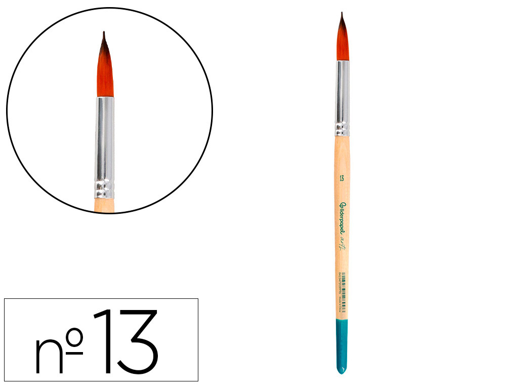 Pincel para pintura acrílica y acuarela Liderpapel nº 13 punta redonda de pelo sintético certificado FSC. Diseñados para su uso con pintura acrílica, acuarela y gouache/témpera, están hechos para ser fuertes, resistentes y flexibles. La mezcla de filamentos sintéticos proporciona una excelente respuesta y control para la aplicación más gruesa del color, manteniendo la forma sin importar la cantidad de agua utilizada. Los pinceles de punta redonda están diseñados para ofrecer una excelente precisión en aplicaciones lineales delicadas. Gracias a su forma, son ideales para detalles finos y trabajos que requieren un control preciso del trazo. La punta redonda permite una aplicación suave y uniforme del color. Disponibles en 19 tamaños diferentes lo que los hace perfectos para técnicas que requieren líneas definidas y detalles minuciosos.