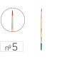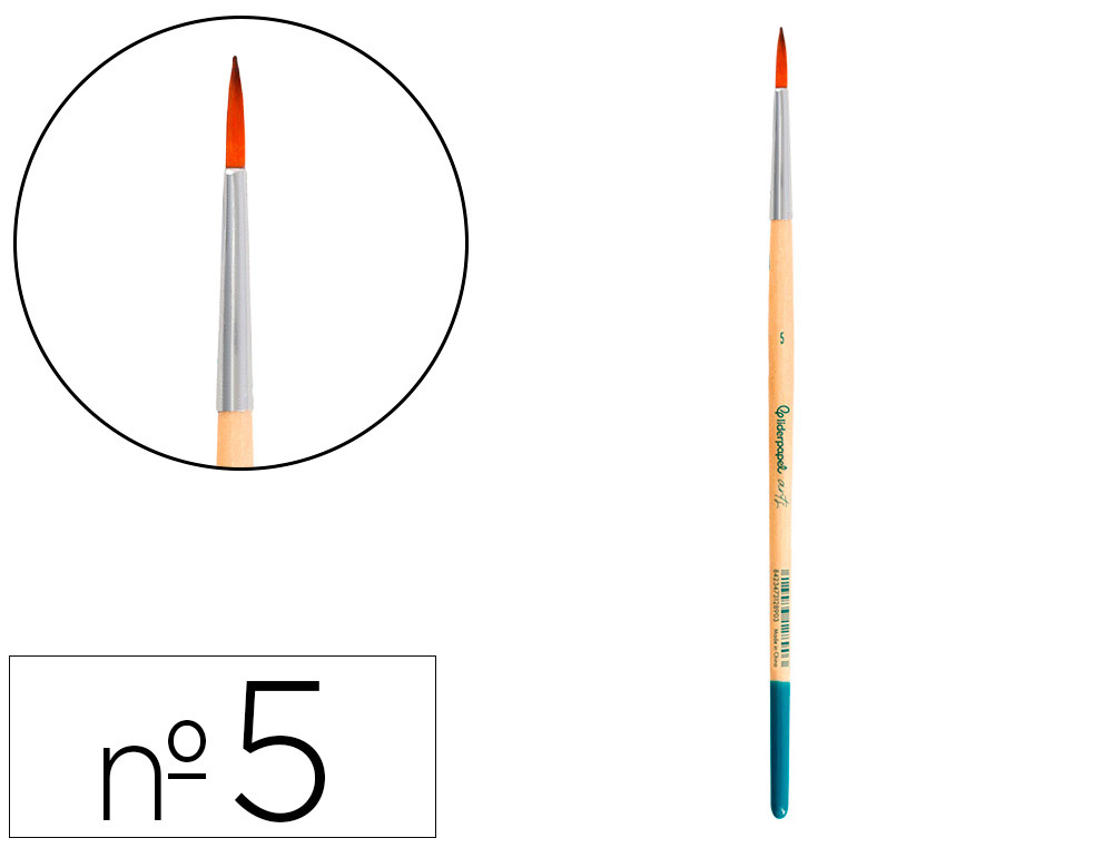 Pincel para pintura acrílica y acuarela Liderpapel nº 5 punta redonda de pelo sintético certificado FSC. Diseñados para su uso con pintura acrílica,acuarela y gouache/témpera, están hechos para ser fuertes, resistentes y flexibles. La mezcla de filamentos sintéticos proporciona una excelente respuesta y control para la aplicación más gruesa del color, manteniendo la forma sin importar la cantidad de agua utilizada. Los pinceles de punta redonda están diseñados para ofrecer una excelente precisión en aplicaciones lineales delicadas. Gracias a su forma, son ideales para detalles finos y trabajos que requieren un control preciso del trazo. La punta redonda permite una aplicación suave y uniforme del color. Disponibles en 19 tamaños los diferentes lo que los hace perfectos para técnicas que requieren líneas definidas y detalles minuciosos.
