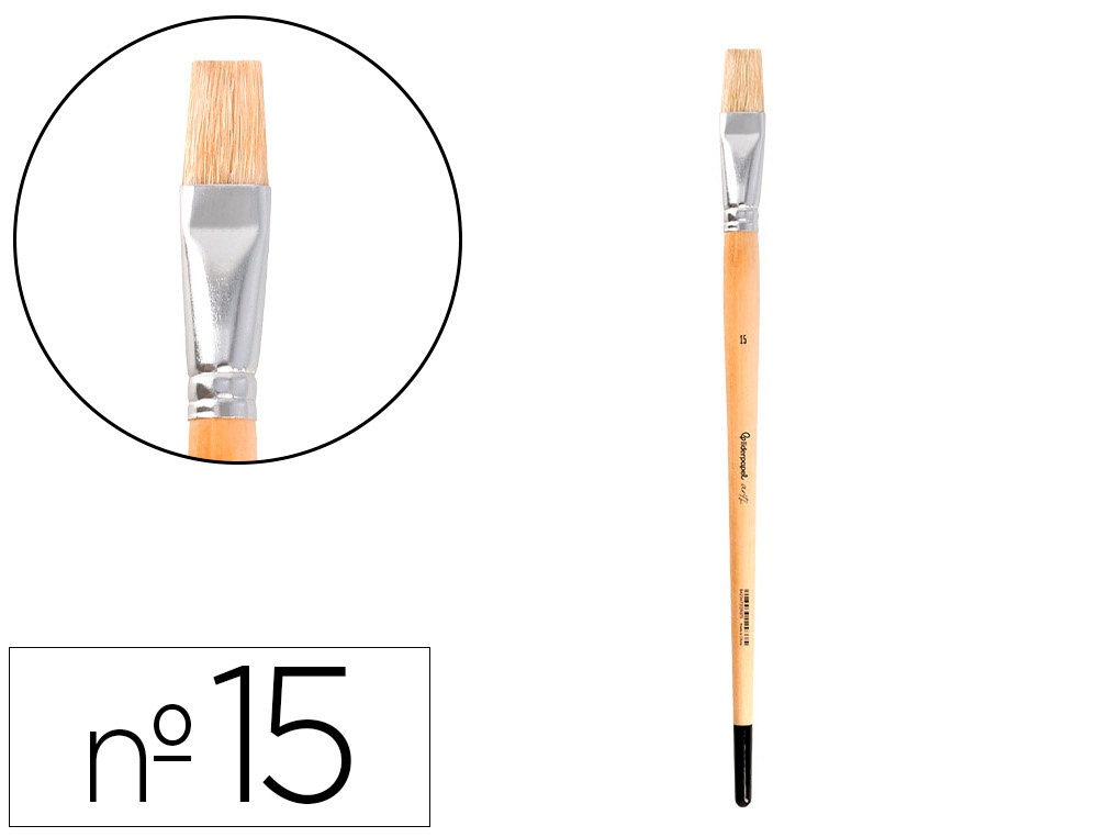 Pincel para pintura al óleo y acrílica Liderpapel nº 15 punta plana de pelo de cerda certificado FSC. Diseñados para su uso con pintura al óleo y acrílica. Los pinceles de pelo de cerda están hechos de cerdas naturales, generalmente de cerdo, que son rígidas y duraderas. Son ideales para técnicas que requieren una aplicación de pintura más vigorosa y texturizada. Estos pinceles son excelentes para trabajar con pinturas más espesas, como óleos y acrílicos, ya que pueden sostener y distribuir grandes cantidades de pintura de manera uniforme. Las cerdas rígidas permiten crear efectos de textura y pinceladas visibles, lo que es perfecto para estilos de pintura expresivos y dinámicos. Los pinceles de punta plana tienen cerdas dispuestas en una forma rectangular, lo que los hace ideales para crear trazos amplios y definidos. Son perfectos para cubrir grandes áreas de color de manera uniforme y para realizar líneas rectas y bordes nítidos.