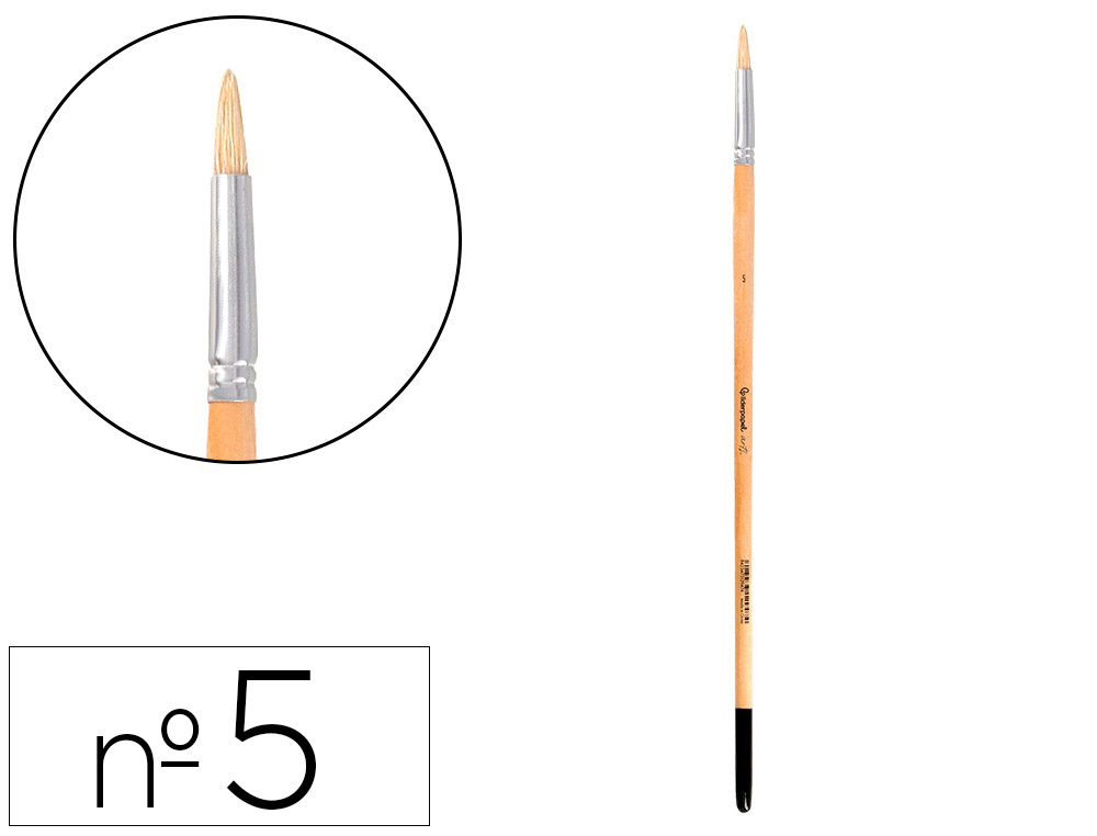 Pincel para pintura al óleo y acrílica Liderpapel nº 5 punta redonda de pelo de cerda certificado FSC. Diseñados para su uso con pintura al óleo y acrílica. Los pinceles de pelo de cerda están hechos de cerdas naturales, generalmente de cerdo, que son rígidas y duraderas. Son ideales para técnicas que requieren una aplicación de pintura más vigorosa y texturizada. Estos pinceles son excelentes para trabajar con pinturas más espesas, como óleos y acrílicos, ya que pueden sostener y distribuir grandes cantidades de pintura de manera uniforme. Las cerdas rígidas permiten crear efectos de textura y pinceladas visibles, lo que es perfecto para estilos de pintura expresivos y dinámicos. Los pinceles de punta redonda tienen cerdas que fo forman una punta afilada, lo que los hace ideales para detalles finos y líneas precisas. Son muy versátiles y se pueden usar para una variedad de técnicas, desde trazos delicados hasta rellenos más amplios cuando se precise pincel.