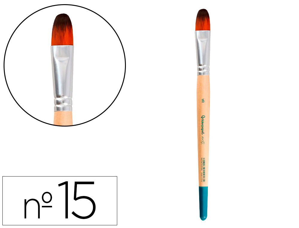 Pincel para pintura acrílica y acuarela Liderpapel nº 15 punta filbert / lengua de gato de pelo sintético certificado FSC. Diseñados para su uso conpintura acrílica, acuarela y gouache/témpera, están hechos para ser fuert es, resistentes y flexibles. La mezcla de filamentos sintéticos proporciona una excelente respuesta y control para la aplicación más gruesa del color, manteniendo la forma sin importar la cantidad de agua utilizada. Los pinceles de lengua de gato, también conocidos como pinceles filbert, combinan las características de los pinceles planos y redondos. Tienen una punta ovalada que permite tanto trazos amplios como detalles finos. Esta forma versátil es ideal para mezclar y suavizar bordes, así como para crear líneaneas precisas y áreas de color más amplias. Los pinceles de lengua de gato son especialmente útiles para técnicas que requieren una transición suave entre colores y para trabajar en áreas curvas o detalladas. Disponibles eos diferentes.