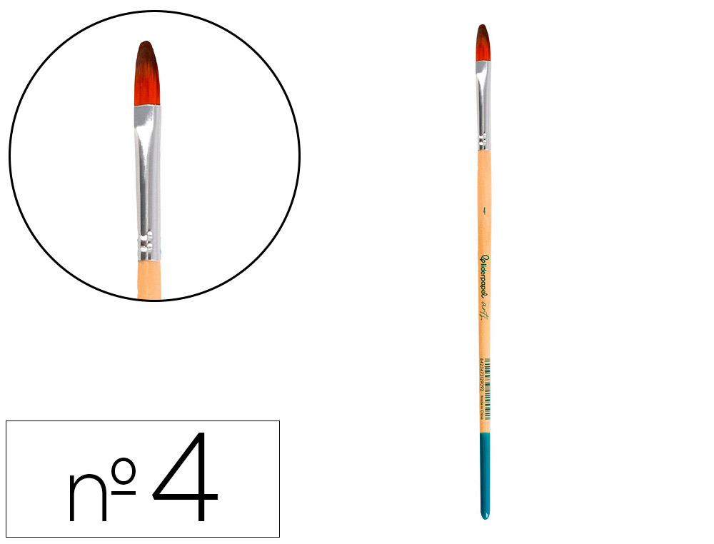 Pincel para pintura acrílica y acuarela Liderpapel nº 4 punta filbert / lengua de gato de pelo sintético certificado FSC. Diseñados para su uso con pintura acrílica, acuarela y gouache/témpera, están hechos para ser fuertes, resistentes y flexibles. La mezcla de filamentos sintéticos proporciona una excelente respuesta y control para la aplicación más gruesa del color, manteniendo la forma sin importar la cantidad de agua utilizada. Los pinceles de lengua de gato, también conocidos como pinceles filbert, combinan las características de los pinceles planos y redondos. Tienen una punta ovalada que permite tanto trazos amplios como detalles finos. Esta forma versátil es ideal para mezclar y suavizar bordes, así como para crear líneaseas precisas y áreas de color más amplias. Los pinceles de lengua de gato son especialmente útiles para técnicas que requieren una transición suave entre colores y para trabajar en áreas curvas o detalladas. Disponibles ens diferentes.