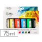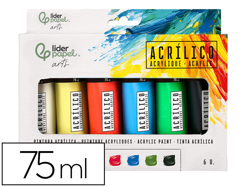 Esta caja incluye 6 tubos de 75 ml cada uno de pintura acrílica, versátiles y prácticos, son perfectos colores de mezcla para dar inicio a tu paletade colores.Contenido: 6 tubos de 75 ml.Colores: (Blanco titanio, Amarillo , Rojo Pirrol, Azul CIAN,Verde oscuro y Negro marfil).Las pinturas acrí licas son muy apreciadas por su rápido tiempo de secado, lo que permite a los artistas trabajar de manera eficiente y aplicar múltiples capas en poco tiempo.Una vez secas, las pinturas acrílicas son resistentes al agua, lo que las hace duraderas y adecuadas para una variedad de aplicaciones.Correcta aplicación con los pinceles sintéticos o pelo de cerda de Liderpapel.Características Principales- Versatilidad: Pueden diluirse con agua para ca crear efectos similares a la acuarela o aplicarse directamente desde el tubo para obtener texturas gruesas y opacas.- Colores Vibrantes: Ofrecen una amplia gama de colores brillantes y saturados que se mantienen establesempo.- Superficies: Son adecuadas para